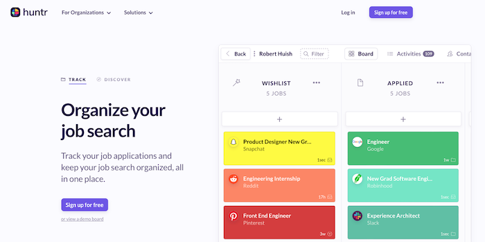 Huntr is a job application tracker and job search platform. Huntr also includes a job search portal that populates from all the major job sites.
