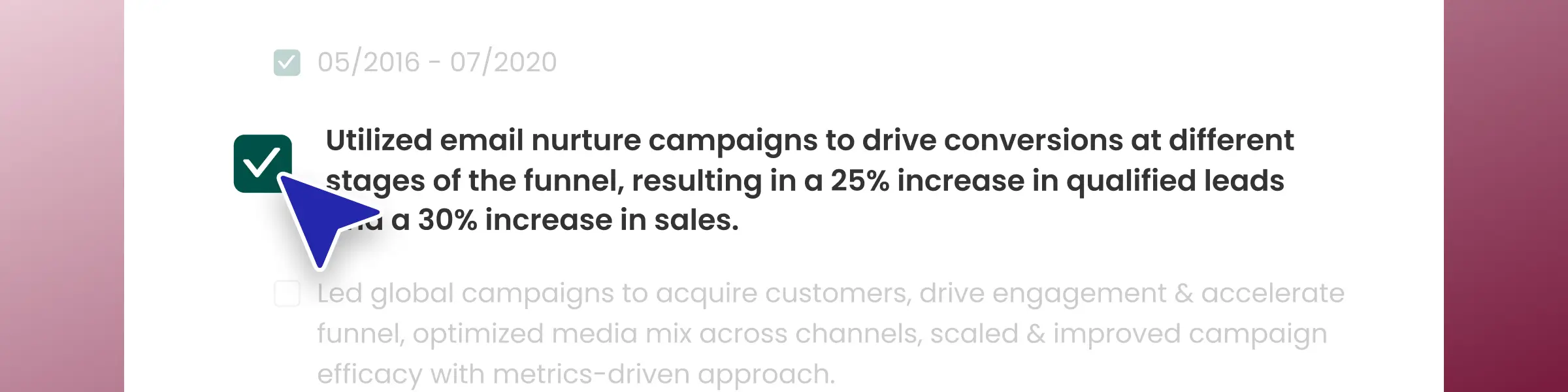 The AI resume writer is trained to optimize sentence structure, use strong action verbs, and emphasize accomplishments over mere responsibilities, allowing you to focus on substance while ensuring consistency and quality.