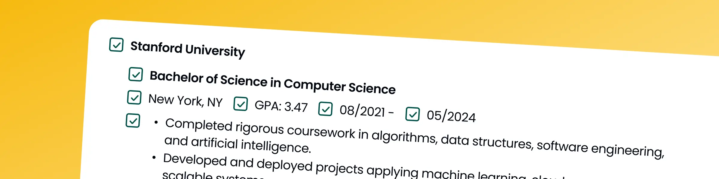 Your education section shows employers the academic foundation behind your qualifications. Always include your degree, school name, location, and graduation date (or expected date if you’re still studying). If relevant, you can also add majors, minors, coursework, research, or honors to highlight expertise that supports your career goals.