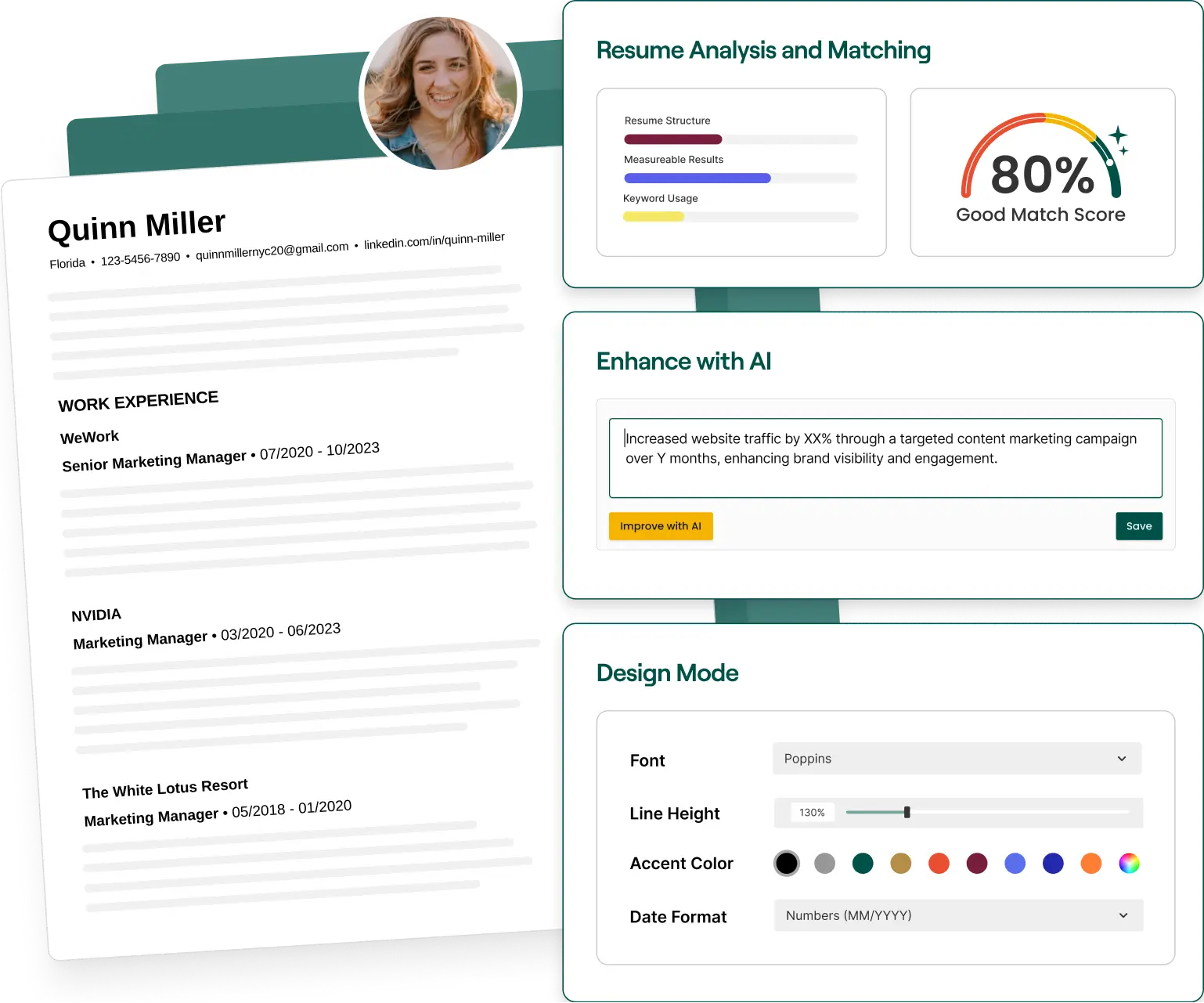 Our Resume Job Description Match is designed to help facilitate the process of tailoring a resume to a specific job. It compares your skills, experiences, and overall language to the content from the job description to uncover patterns, insights that can add clarity to your process.